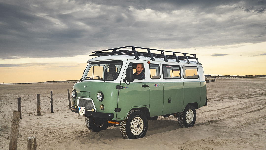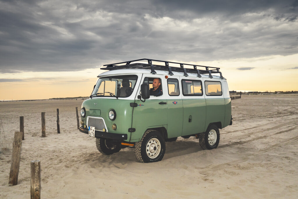Der Buchanka wohnt in Sankt Peter-Ording und kommt regelmäßig auf den Strand gefahren.
